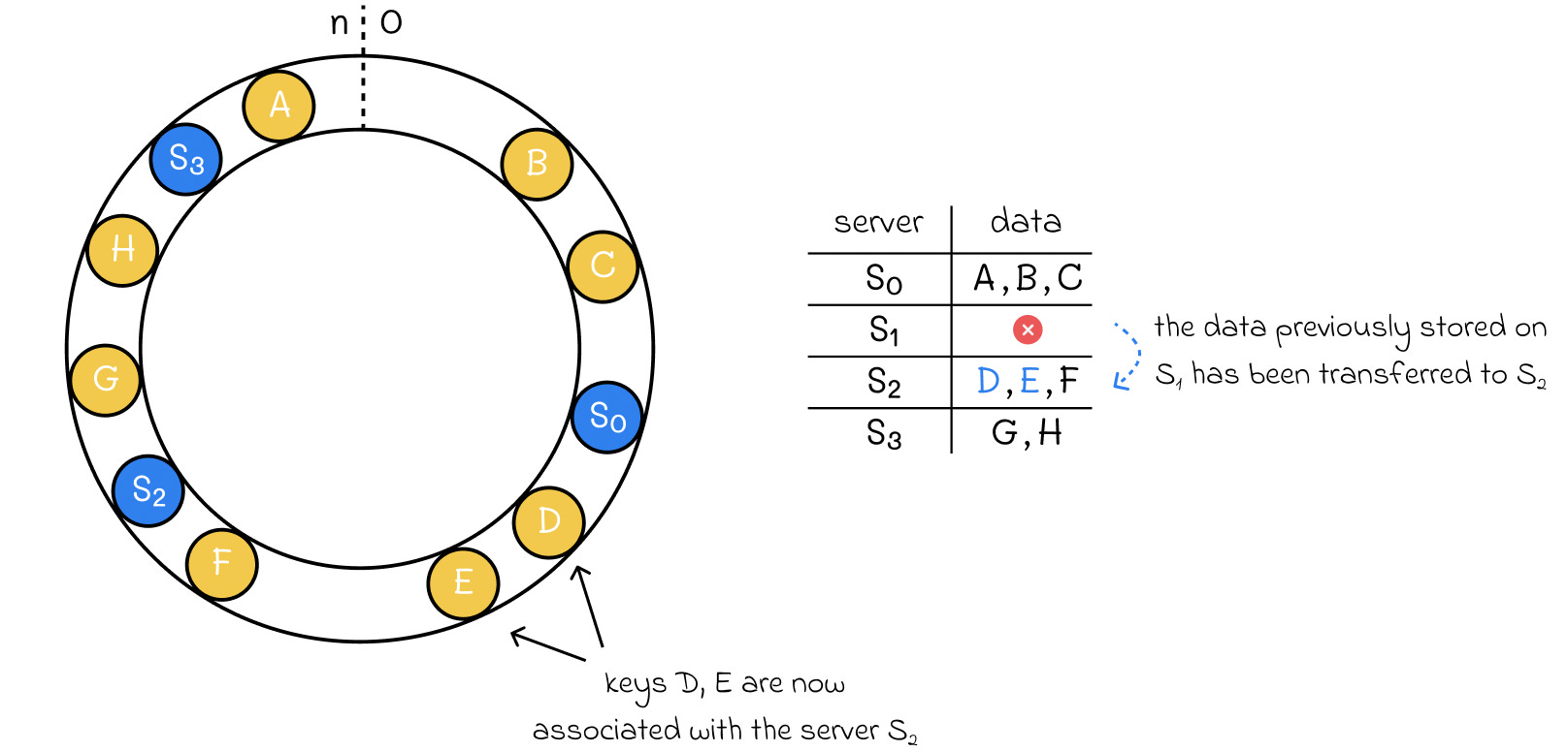 If Server 1 catches fire and dies, it is removed from the ring.