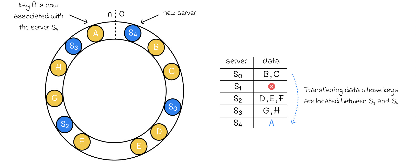Let’s say you add Server 4 to handle a traffic spike. Server 4 is hashed and lands between Server 3 and Server 0 on the ring.