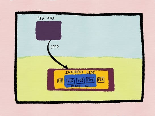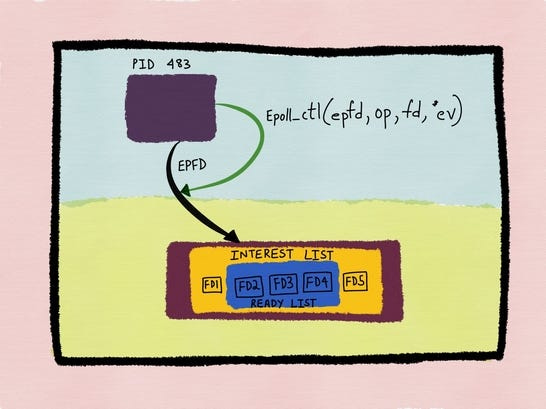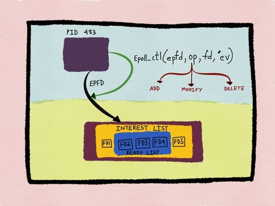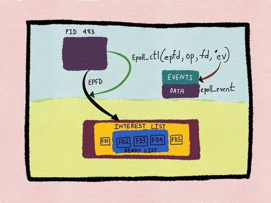 epoll introduces a persistent kernel object called an epoll instance. You create it once, then register file descriptors along with the events you care about—readability, writability, errors, and so on.