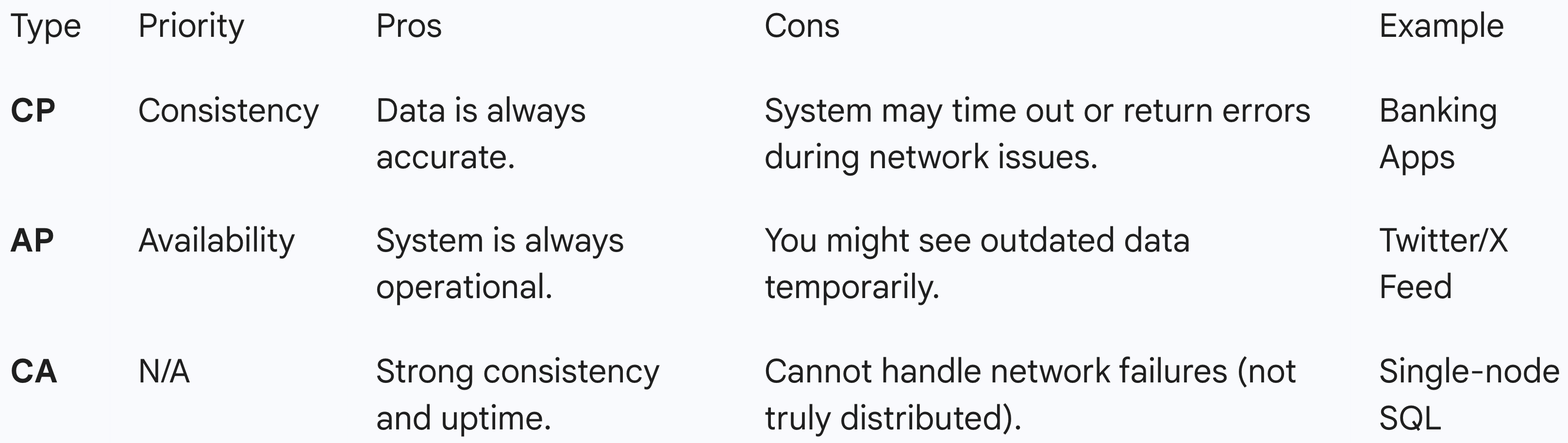 CA systems attempt to provide perfect consistency and perfect availability simultaneously, but this combination comes with a major catch: it implies the system generally cannot tolerate network partitions. Because network failures are inevitable in any distributed system (systems spread across multiple computers), CA essentially only exists in non-distributed, single-node systems. If a CA system is distributed and a network failure does happen, it must fail; it cannot maintain both C and A. Therefore, traditional relational databases like MySQL or PostgreSQL are considered CA systems only when running on a single server, as they prioritize accurate data and uptime but lack built-in mechanisms to handle network separation across a cluster gracefully.