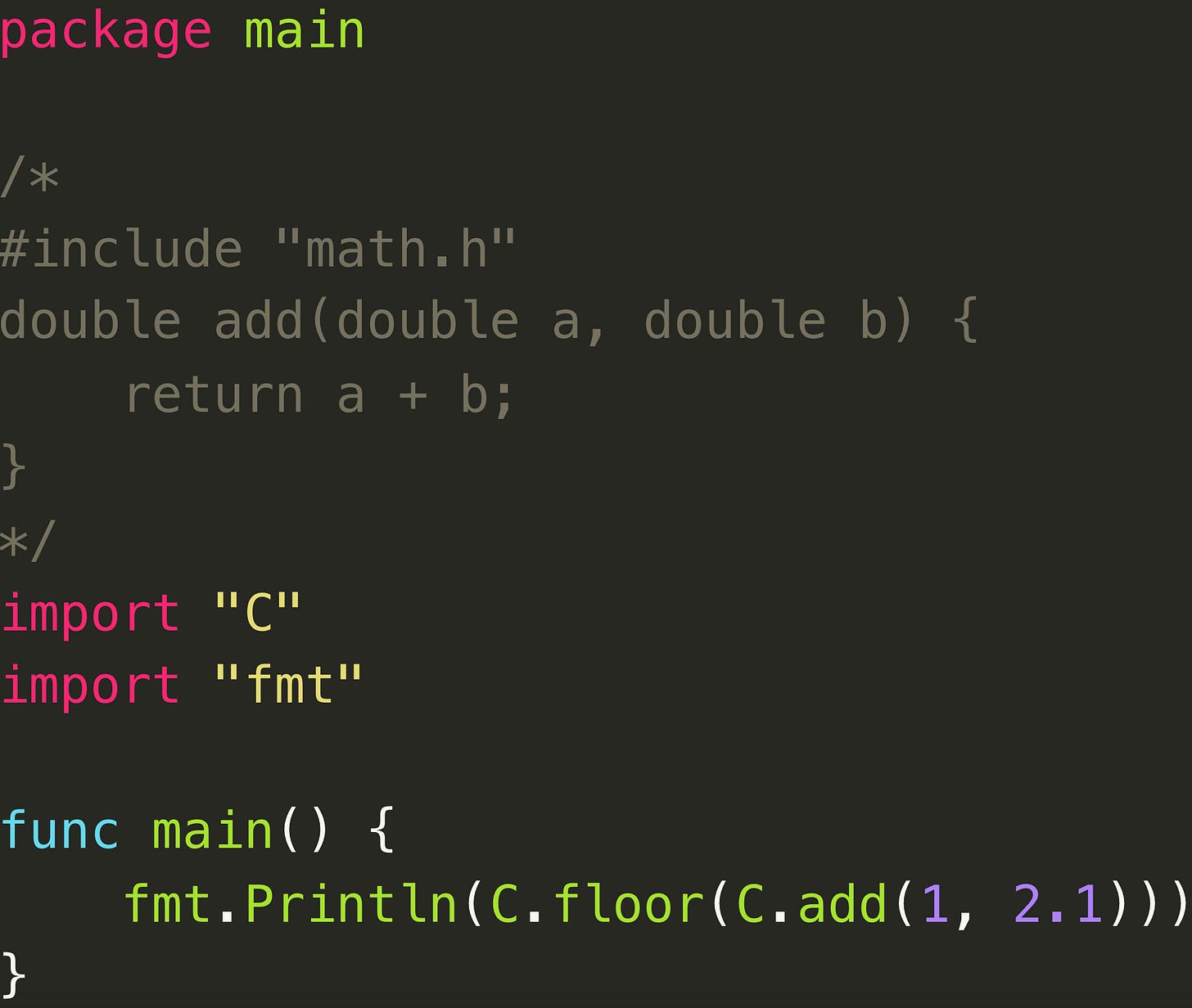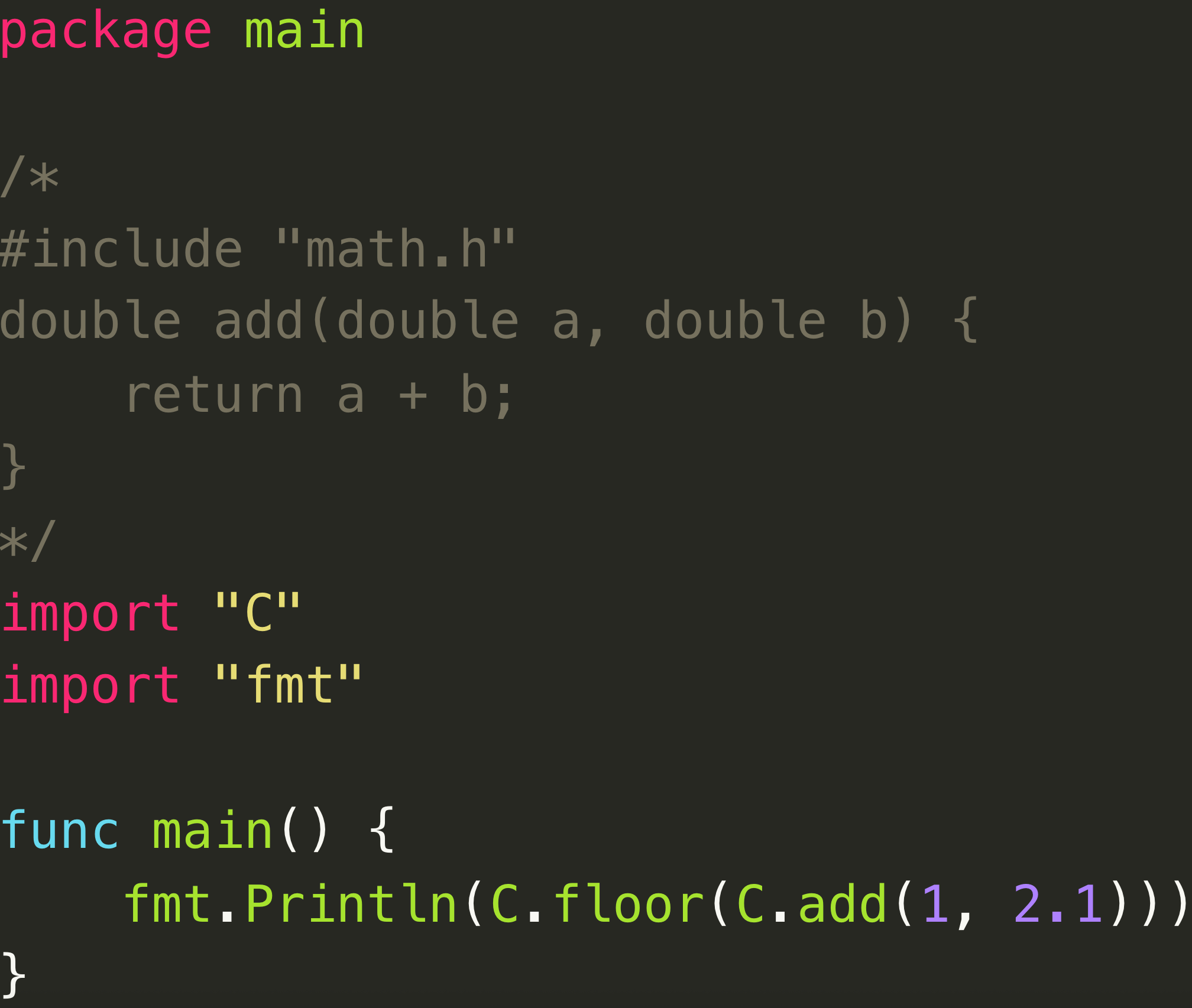 result := C.add(2, 3)